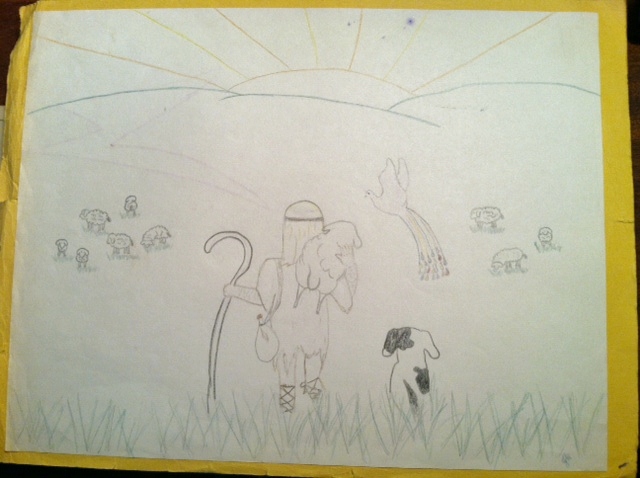 At that tender age, I had never experienced a true valley, but the words of the Psalm so moved me that I set out to memorize it. As I learned the Psalm, His words penetrated my heart. The children’s book that I read also talked about a loving shepherd who had lost his sheep. He set out to find it and rejoiced when he did. It was then that I first felt the gentle tug from my true Shepherd, though I didn’t understand that until later. And, as children often do, I drew a picture about what was on my mind. It was a simple child’s rendering of the shepherd in the story finding his lost sheep.